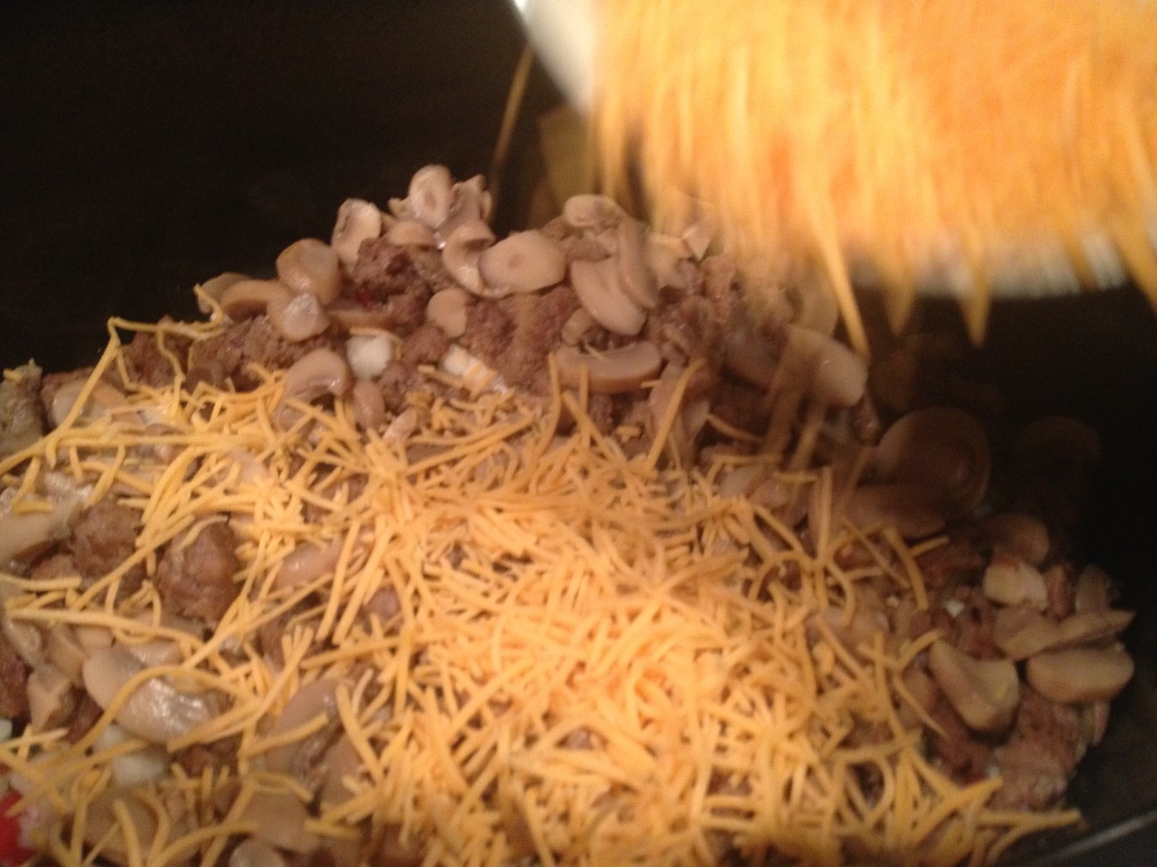 7. Pour the egg mixture on top of the potatoes, sausage, mushrooms, and cheese.